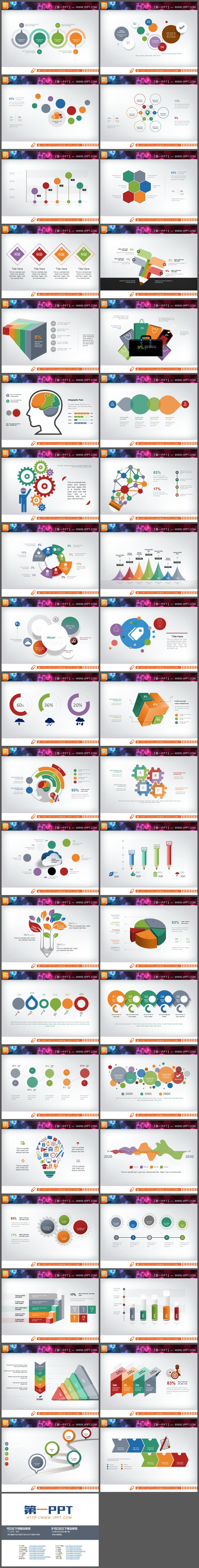 40套彩色精致商务PPT图表合集。PPT图表采用了彩色扁平化风格设计制作。图表类型包括:柱状图、时间轴、组合关系、层级关系等。.PPTX格式;