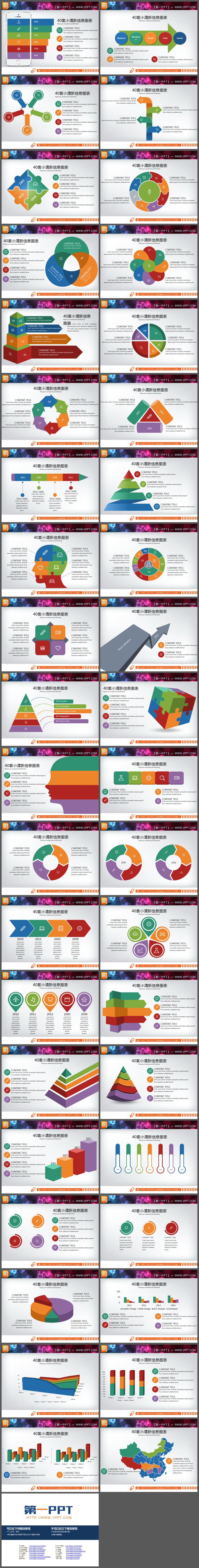 40张彩色小清新PPT图表合集。图表采用了扁平化风格设计。图表类型丰富,包括各种关系图、柱状图、地图、人脑图等。适合用于制作简洁清新风格PowerPoint。.PPTX格式;