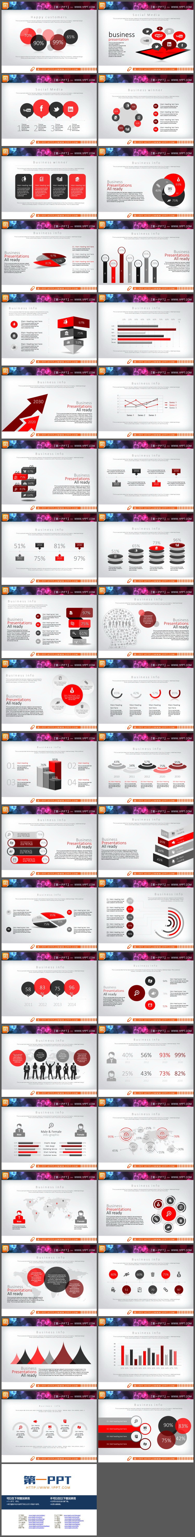 40页红黑扁平化商务PPT图表大全,图表类型丰富,适合用于制作各类商务演示PowerPoint。.PPTX格式;