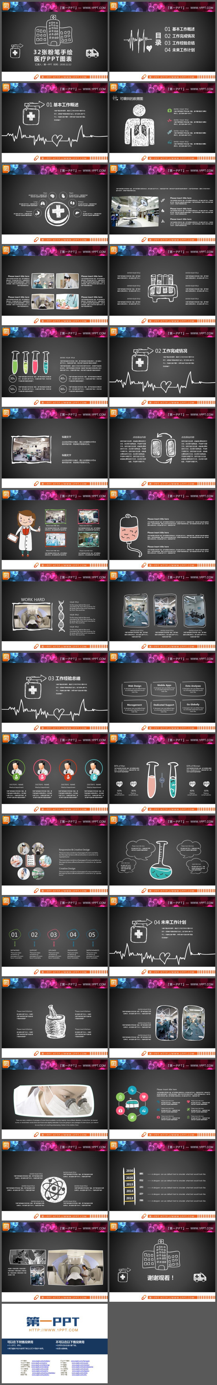 这是32套白色粉笔手绘医疗PPT图表。PPT图表采用了多个医疗元素设计,包括:医院、救护车、医疗包、输液瓶、心电图等。.PPTX格式;
