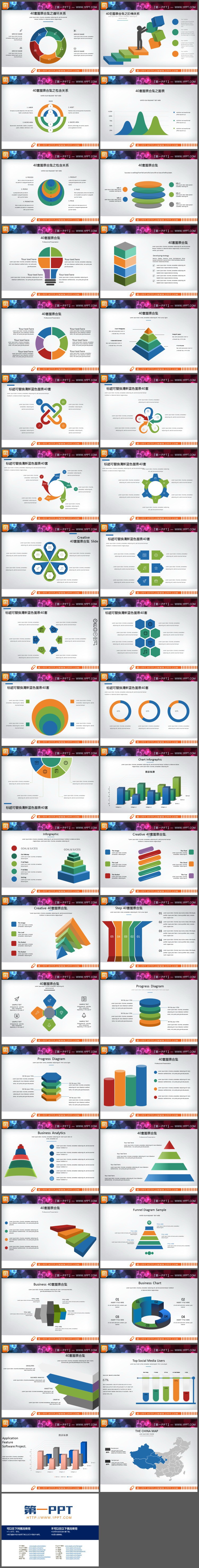 这是40套彩色实用PPT图表合集,图表类型包括:循环关系、阶梯递进关系、包含关系、曲线图、柱状图等。适合用于制作数据统计、数据分析PowerPoint。.PPTX格式;