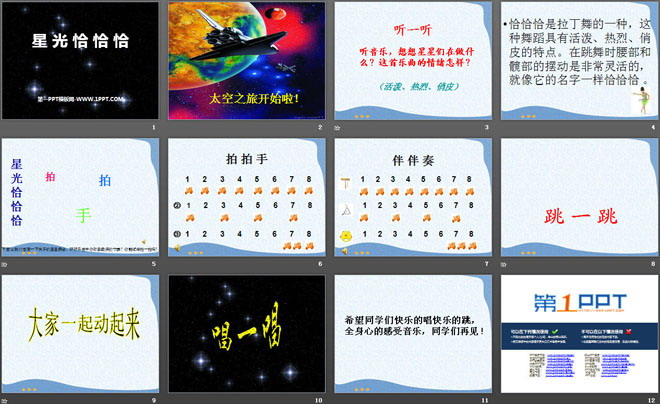 关键词:星光恰恰恰教学课件,一年级上册音乐PPT课件下载,一年级音乐幻灯片课件下载,星光恰恰恰PPT课件下载,.PPT格式;