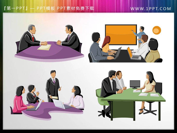 这是4张彩色,围绕在会议桌前进行商务会议的PPT剪切画。.PPTX格式;