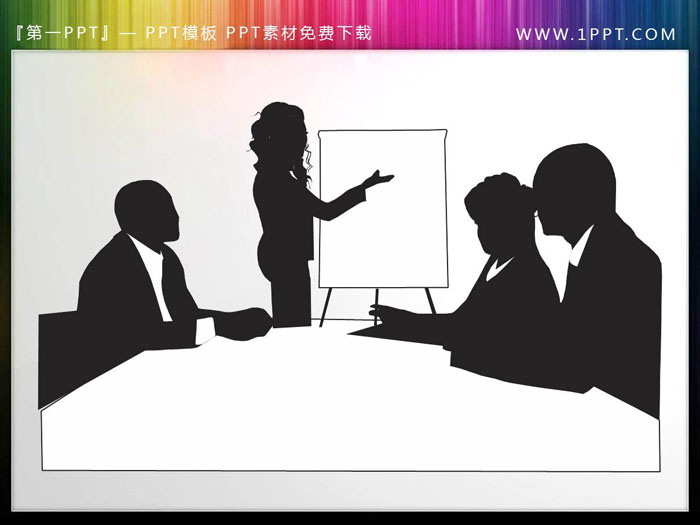 这是5张黑色,会议主题PPT人物剪影。包括场景:会议桌前讨论,白板前讨论等。.PPTX格式;