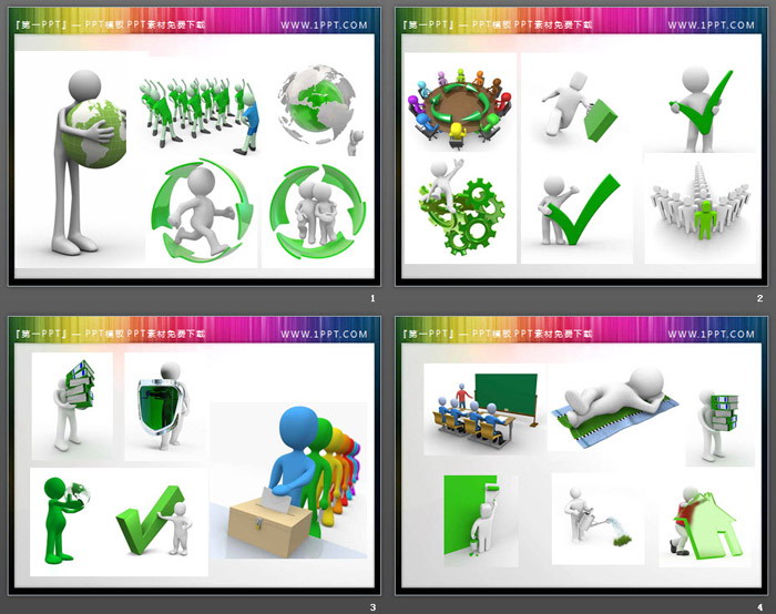 这是100张绿色调的,3D立体白色小人PPT素材。。包括了各种生活主题,如:环境保护、数据分析、会议办公、体育运动、医疗健康等。.PPTX格式;