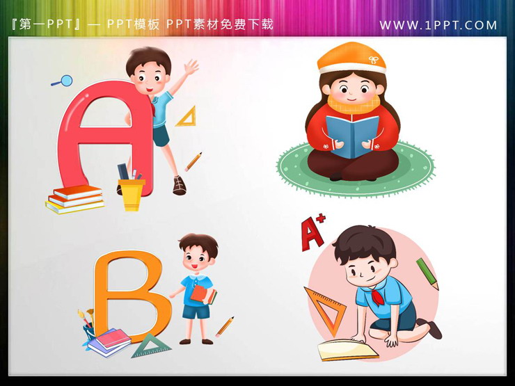 10张卡通学生学习PPT插图素材,背景元素包括:学生读书、课堂举手回答问题等。.PPTX格式;