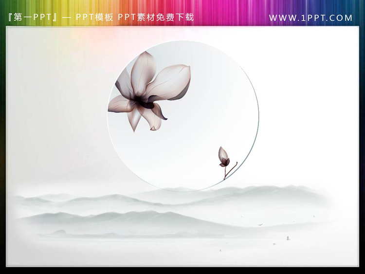 水墨群山花朵PPT素材,PPT素材元素包括:淡雅水墨群山,植物花朵等。.PPTX格式;