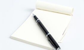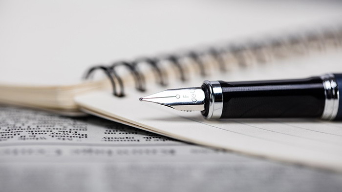 这是一张钢笔记事本背景的写作相关PPT背景图片;