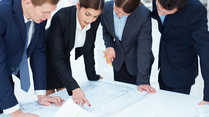 四位身穿职业装的商务人物正在围着图纸讨论。