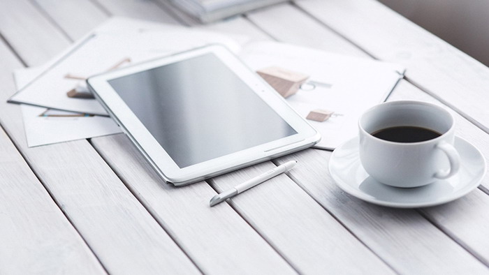 这是一张白色木板iPad咖啡杯PPT背景图片;