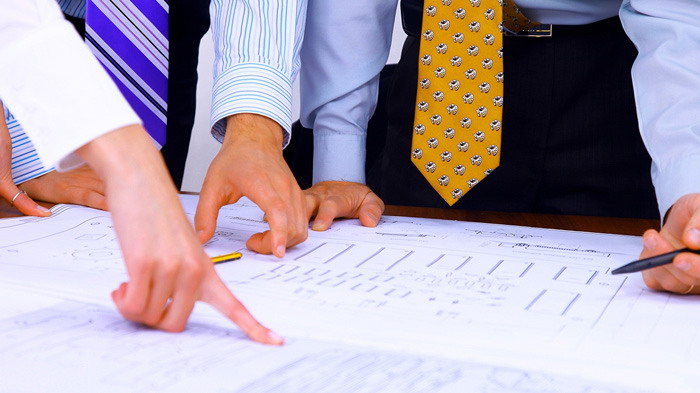 商务人物与建筑图纸PPT背景图片