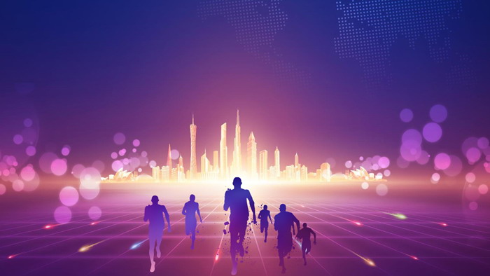 关键词:金色城市、紫色光晕、奔跑人物剪影PowerPoint背景图片,.jpg格式;