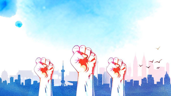 拳头城市剪影撸起袖子加油干主题PPT背景图片