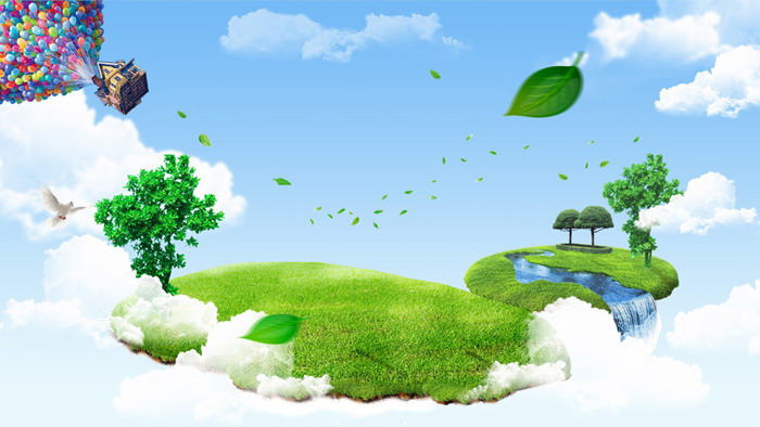 这是两张蓝天白云飞屋气球PPT背景图片,背景元素:蓝天白云、草地、绿叶、气球、飞屋。.png格式;