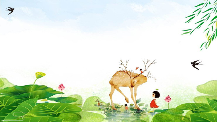 这是四张清新水彩荷花荷叶PPT背景图片,背景元素包括:荷花、荷叶、柳条、燕子、小鹿、小女孩等。.PPTX格式;