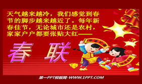 这是一份极具中国特色的,动态新春贺喜拜年祝福幻灯片模板。第一PPT模板在这里送给广大网友,祝大家新年快乐,万事如意;本PPT共17张动态PPT动画组成,幻灯片放映开始,有祝愿歌作为PPT背景音乐。各种中国元素的新年PPT背景图片动态演示。非常喜庆,适合用于制作新年贺卡PPT,公司企业新年庆典PPT等。关键词:红色幻灯片背景,动态PPT模板,动画,喜庆,马年,福字,拜年,春联幻灯片背景图片,元旦,新年,春节PPT模板下载,.PPTX格式;