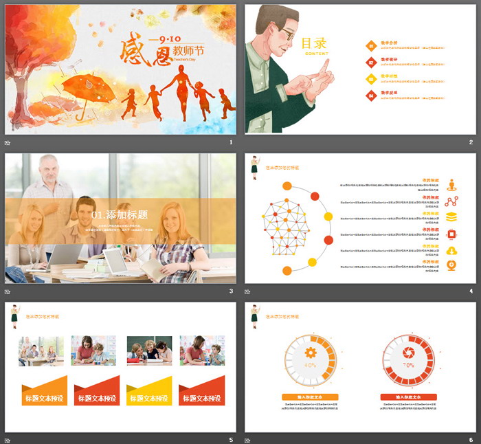 关键词:教师节PPT模板,橙色扁平化幻灯片图表,感恩教师节PowerPoint模板,.PPTX格式;