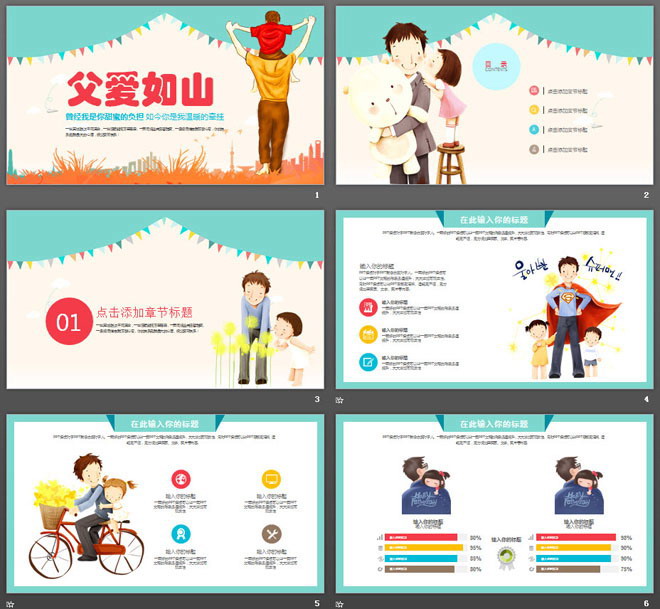 这是一套卡通父爱如山主题的,父亲节PPT模板,共25张。第一PPT模板网提供精美节日幻灯片模板免费下载;