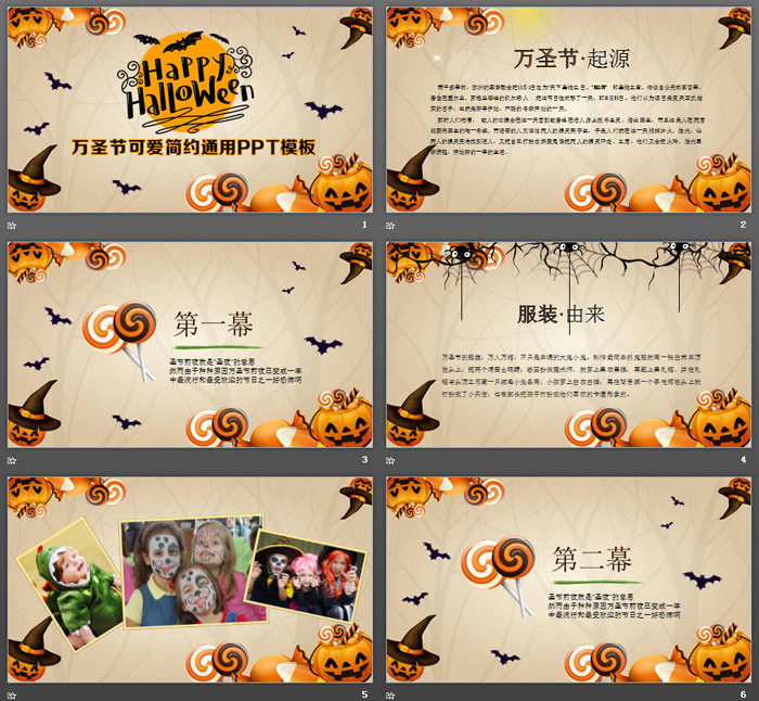 幻灯片模板内容方面,介绍了关于万圣节起源、万圣节的服饰、万圣节南瓜灯等内容;