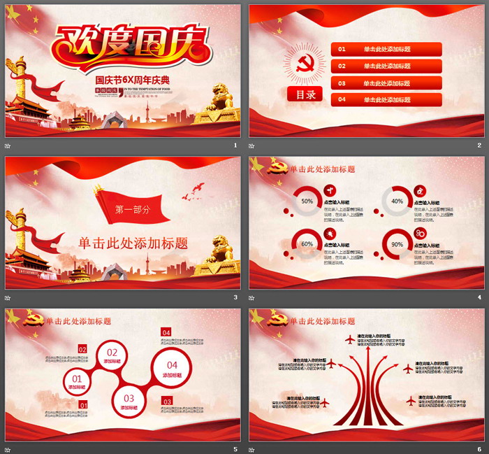 PPT模板内容页面,使用了红色扁平化设计风格,制作了22张幻灯片图表。方便制作国庆节庆典幻灯片。