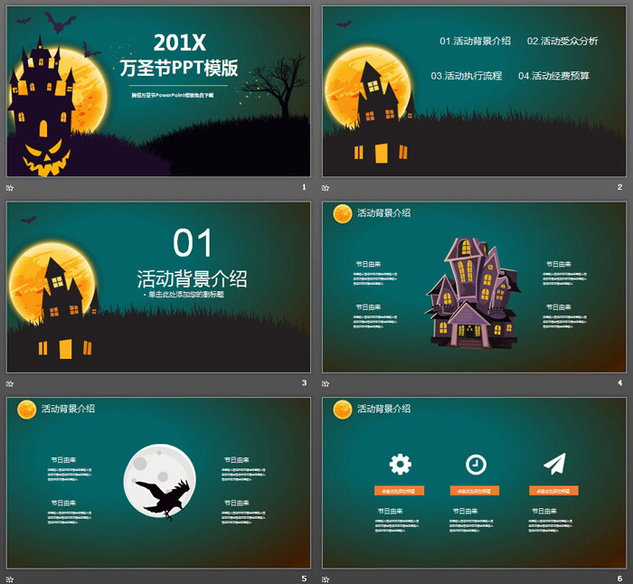 这是一套夜空下古堡与蝙蝠背景的万圣节PPT模板,共23张。
