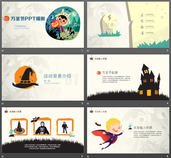 PowerPoint模板内容页面,使用了猫咪、蝙蝠、城堡、女巫、僵尸等卡通图片作为编辑素材。