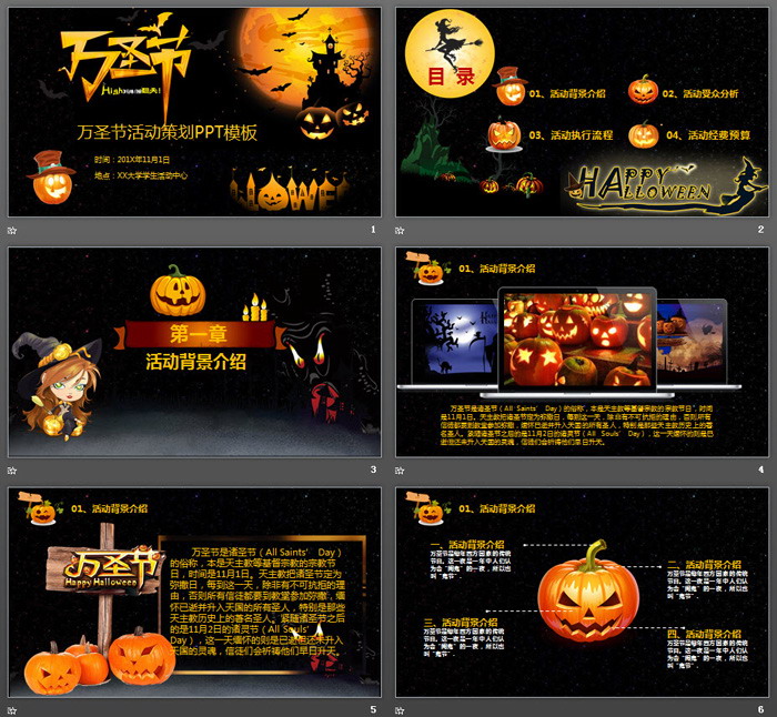 这是一套黑色城堡背景的,万圣节活动策划PPT模板,共25张。