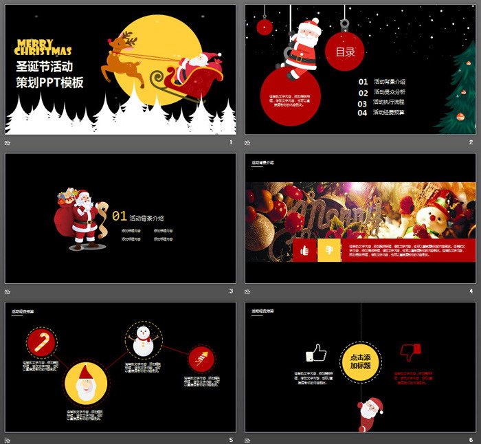 这是一套乘坐驯鹿雪橇的圣诞老人PPT模板,共24张。