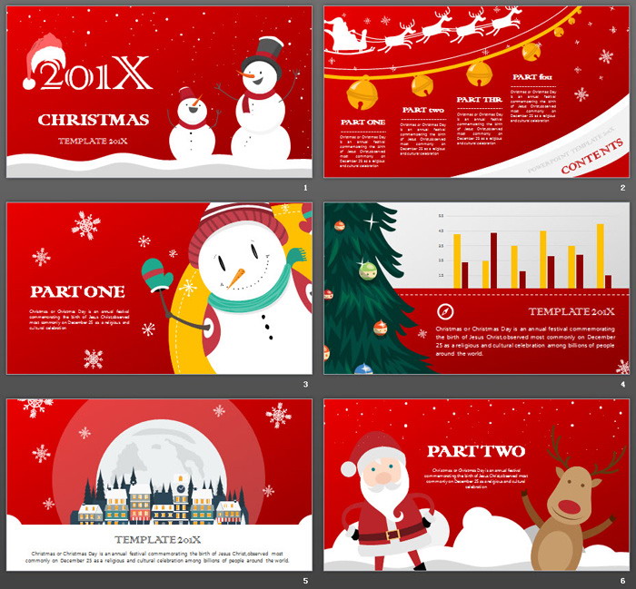 幻灯片模板使用了喜庆红色渐变作为背景。两个圣诞雪人在雪地里开心的笑着,洋溢着节日的喜庆。