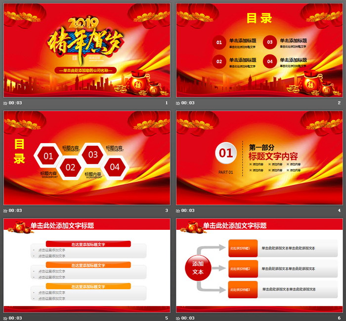 幻灯片模板使用了新年喜庆红色,作为主题色。PPT模板封面,使用了城市剪影、红色灯笼、福袋作为背景图片,中间使用了2019猪年贺岁立体艺术字作为PPT标题。