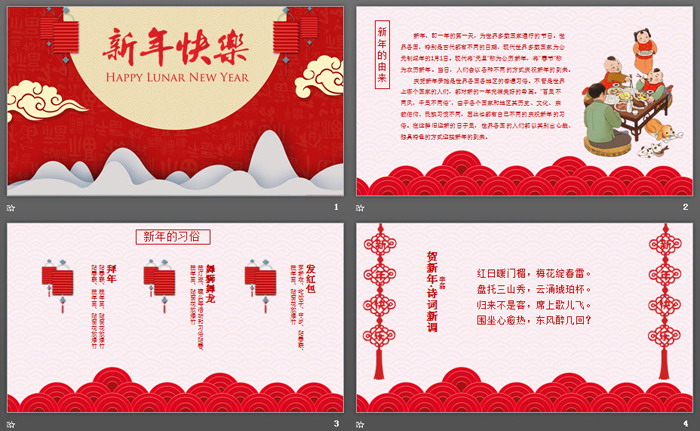 关键词:HappyNewYear PowerPoint模板。动态新年幻灯片模板,红色喜庆春节PPT模板,财神、福娃、灯笼、祥云、年夜饭PPT背景图片,.PPTX格式;