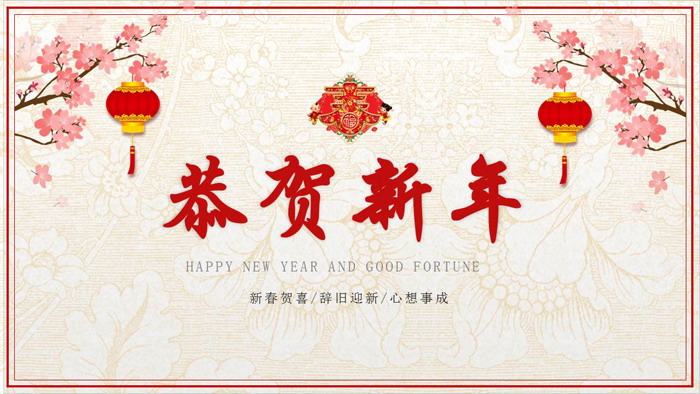 关键词:新年贺卡PPT下载,恭贺新春、新春祝福PowerPoint模板,灯笼、梅花、元宝、舞狮幻灯片背景图片,.PPTX格式;