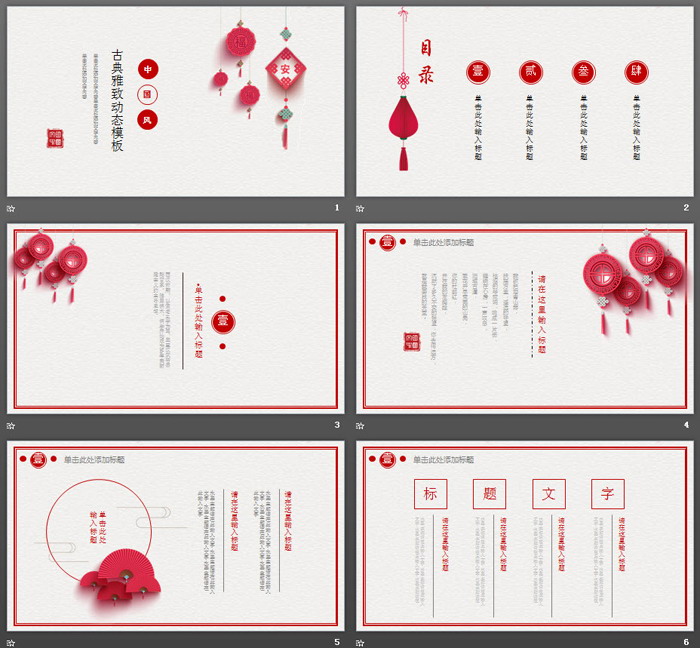 幻灯片模板使用了中国古典花纹作为底图。PPT封面使用了中国福字和平安样式的吊坠作为背景图片,PPT标题使用竖版排列。界面设计精致赋有中国风感觉。