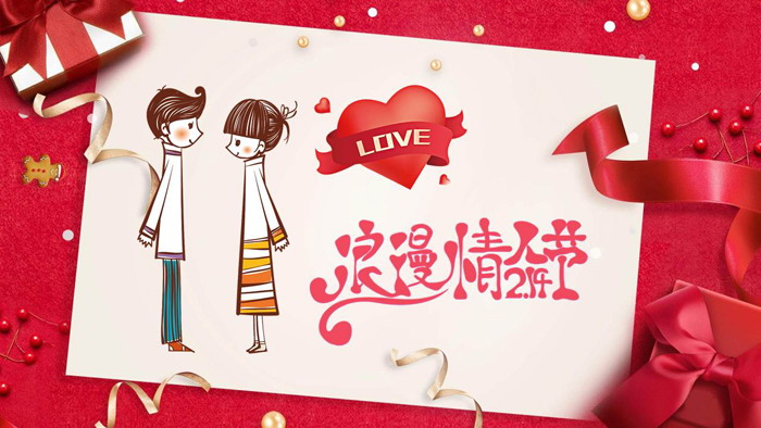 幻灯片模板封面,使用了卡通手绘的情侣人物、红色精致礼品包装图片作为背景。中间填写2.14浪漫情人节PPT标题。界面设计精美浪漫。