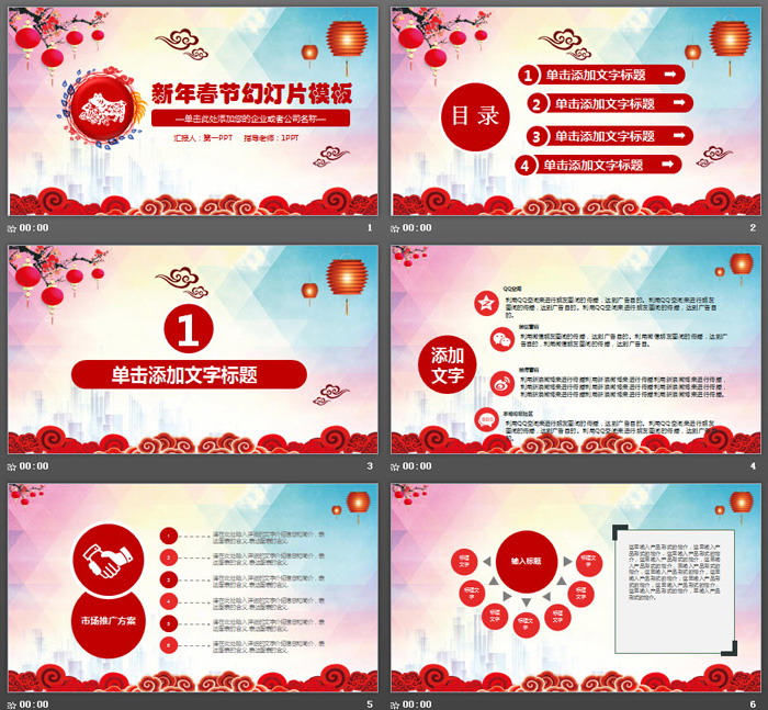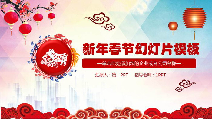 幻灯片模板封面,使用红色灯笼、梅花、祥云图案以及剪纸猪图案作为背景图片。中间放置新年春节PPT标题。界面设计喜庆充满中国元素。