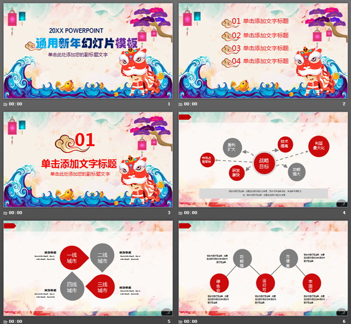 关键词:元旦、春节、新年幻灯片模板,波涛、鲤鱼、松枝、灯笼、舞狮PPT背景图片,.PPTX格式;