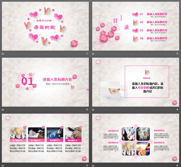 这是一套温馨爱心背景的,母亲的爱PPT模板,共26张;