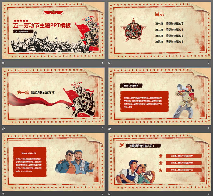 幻灯片模板使用了旧纸张图案作为底图,红色边框和五角星作为边框。PPT模板首页,放置了劳动人民剪贴画和红色飘带。界面带有浓郁的岁月感。