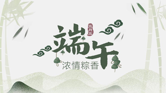 幻灯片模板使用了一张淡雅绿色竹林图片作为底图。中介放置端午艺术字、祥云图案、粽子等图案。