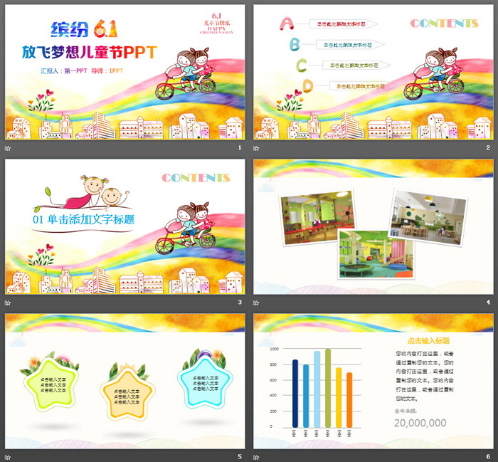 幻灯片模板封面,使用了五彩缤纷的颜色手绘设计。两个可爱的儿童骑着脚踏车行驶在彩虹之上。下面是可爱的小镇建筑。模板设计卡通可爱充满童趣,与六一儿童节主题搭配。