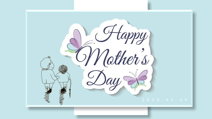 幻灯片模板封面,使用了蓝色悬浮矩形作为边框。中间一位儿子搀扶着拄着拐棍的年老的母亲。中间使用英文艺术字填写,Happy Mother's Day幻灯片标题。界面设计清爽简洁,但是充满了感动。