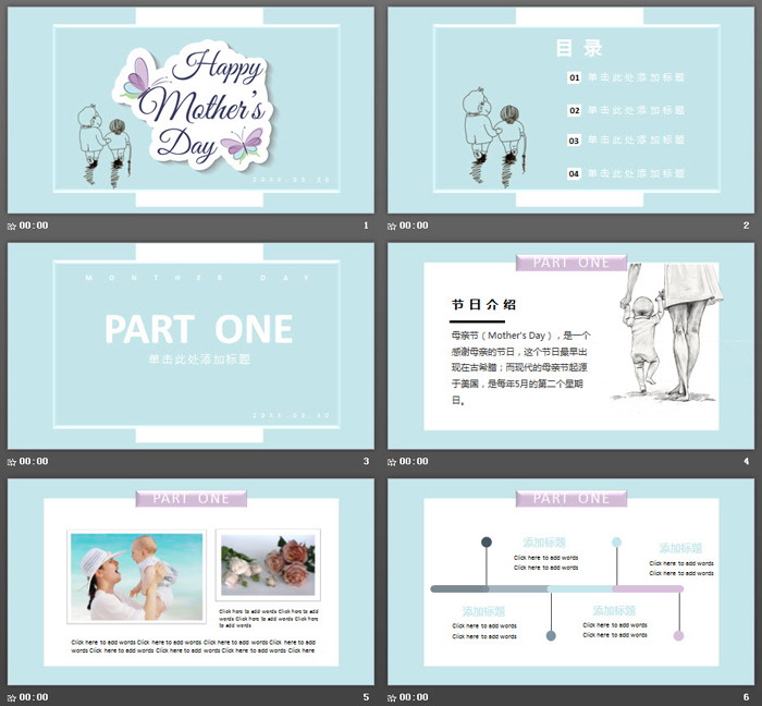 这是一套蓝色清爽风格的,母亲节快乐PPT模板,共23张;