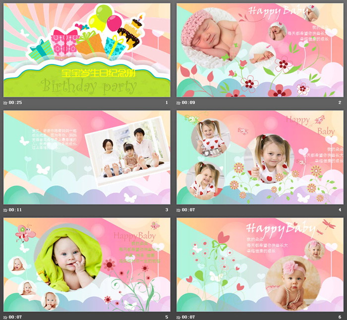 幻灯片模板封面,使用了彩色云朵、蝴蝶、爱心、彩色热气球、生日礼物、生日蛋糕、Happy Baby,Birthday party艺术字等元素,制作了宝宝生日相册PPT开场动画。