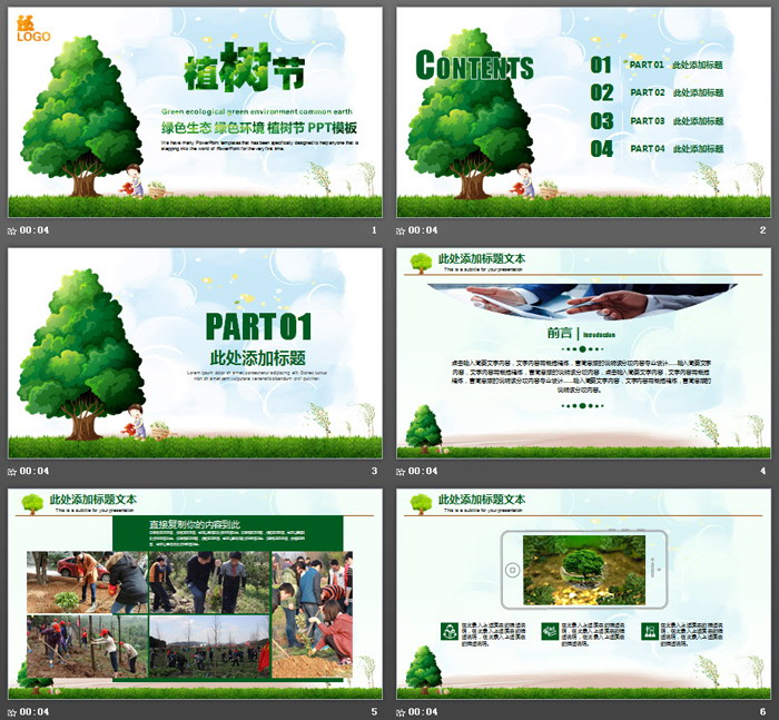 PowerPoint模板内容页,由30张绿色扁平化幻灯片图表制作。另外使用了多张植树节这天的植树照片进行排版。