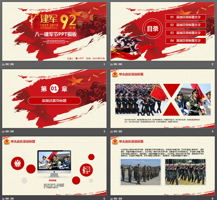 PowerPoint模板内容页,由24张红色幻灯片图表制作。另外使用了阅兵图片、三军图片进行排版。