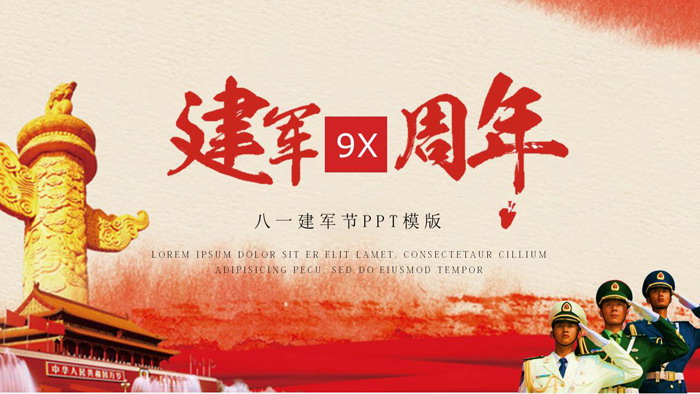 幻灯片模板封面,使用了红色水墨底图,上层使用了金色华表、天安门、三军敬礼图片作为背景。中间填写 建军9X周年PPT模板。界面设计大气庄严。