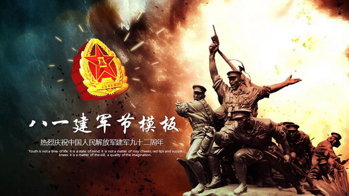 幻灯片模板使用了硝烟弥漫的战场图片作为背景。PPT模板封面放置了军队雕塑与八一军徽作为背景图片。