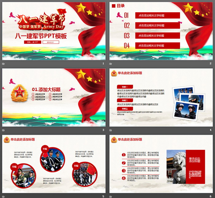 PowerPoint模板内容页,由26张红色动态幻灯片图表制作。另外使用了军队图片、天安门图片、石狮子图片、八一军徽等进行装扮。