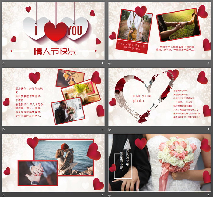 PowerPoint模板内容页,由多张爱心装饰的情侣照片、婚礼照片、牵手照片等进行排版。
