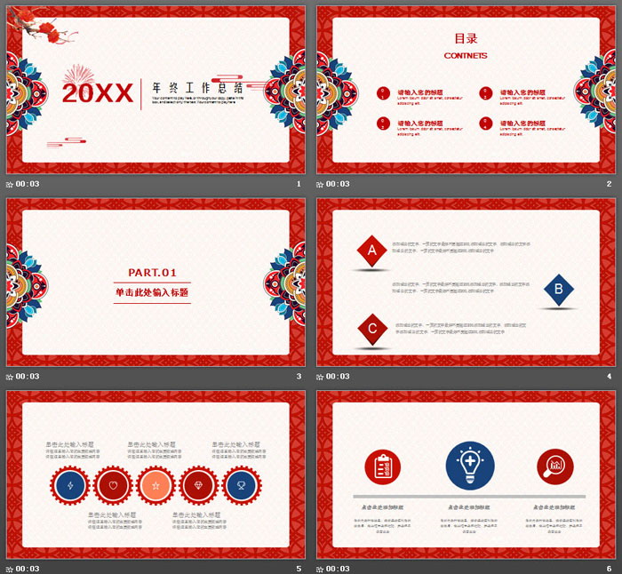 这是一套红色古典新年元素背景的,年终工作总结PPT模板,共25张;